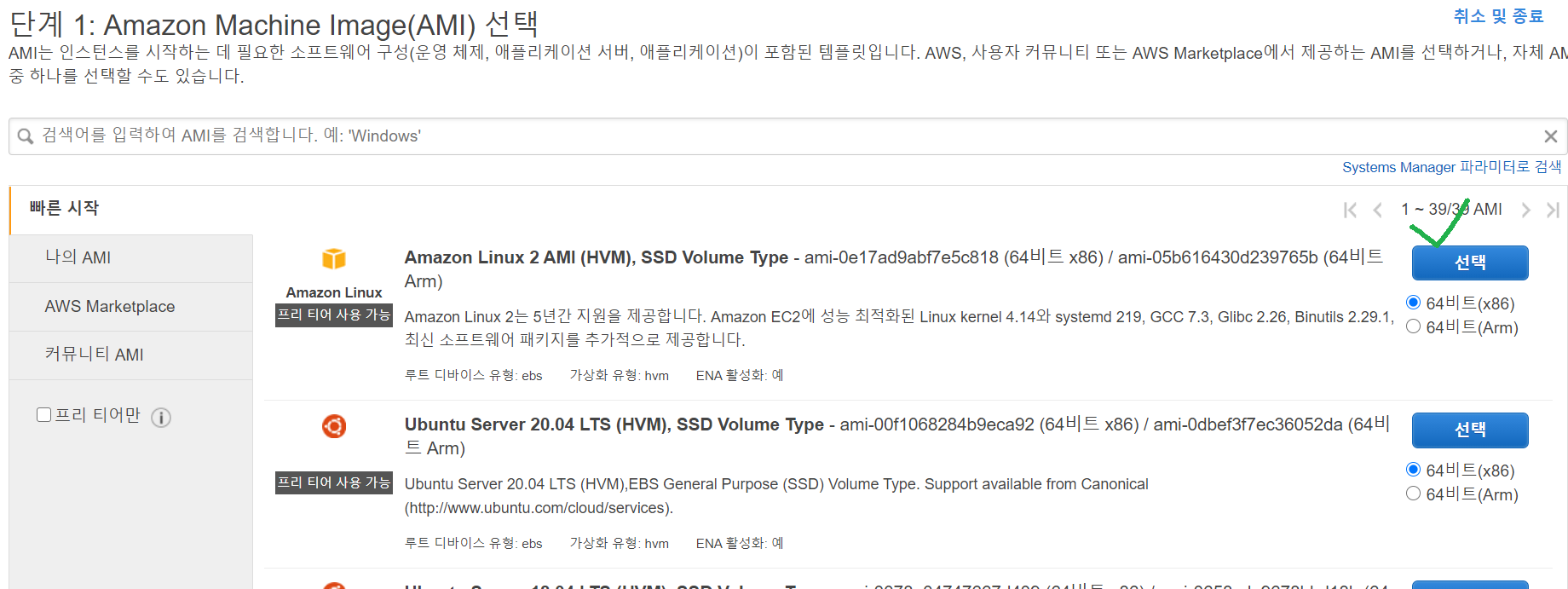단계 1 : Amazon Linux 이미지를 선택해줍니다