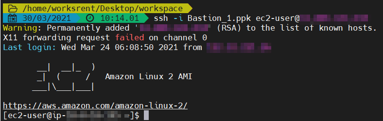 명령어를 치게 되면 Bastion Host에 정상적으로 접속이 되는 걸 보실 수 있습니다.
