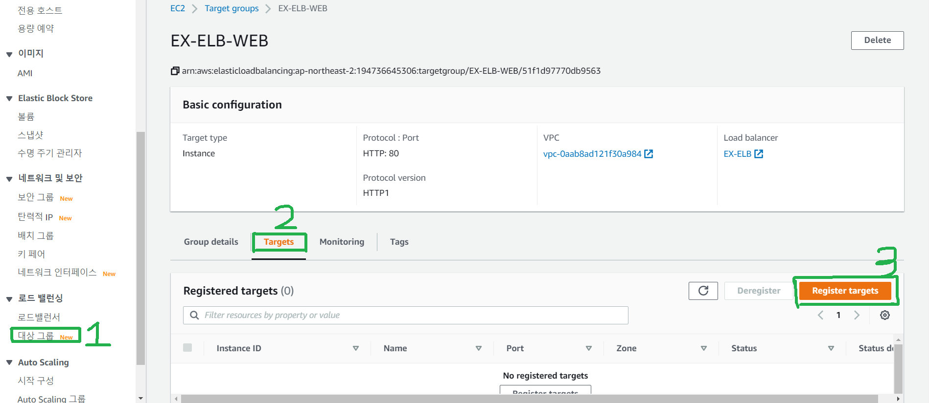 로드밸런싱 - 대상그룹 - target - Register targets를 클릭해줍니다.