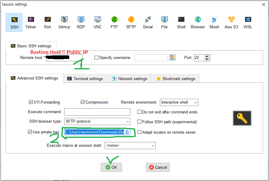 1. Bastion Host에 붙여준 Elastic IP ( Public IP )를 기입해주겠습니다.
