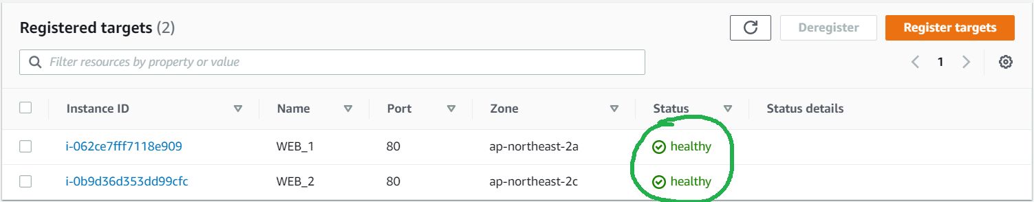 External - ELB에서 WEB server 1, 2를 등록해주겠습니다.