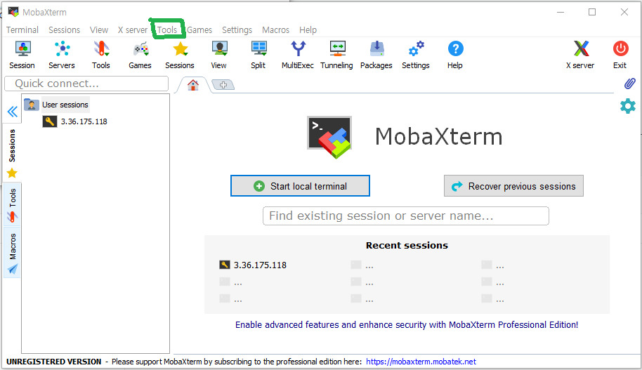 MobaXterm 창에서 상단에 위치한 Tools 버튼을 클릭해줍니다.