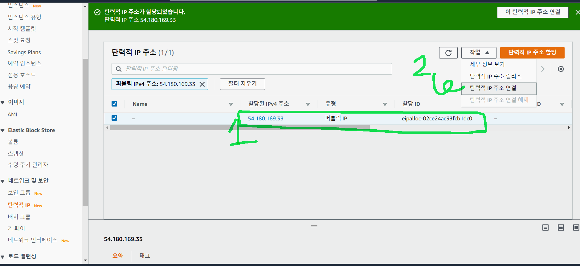 작업 ☞ 탄력적 IP 주소 연결을 클릭하여 줍니다.