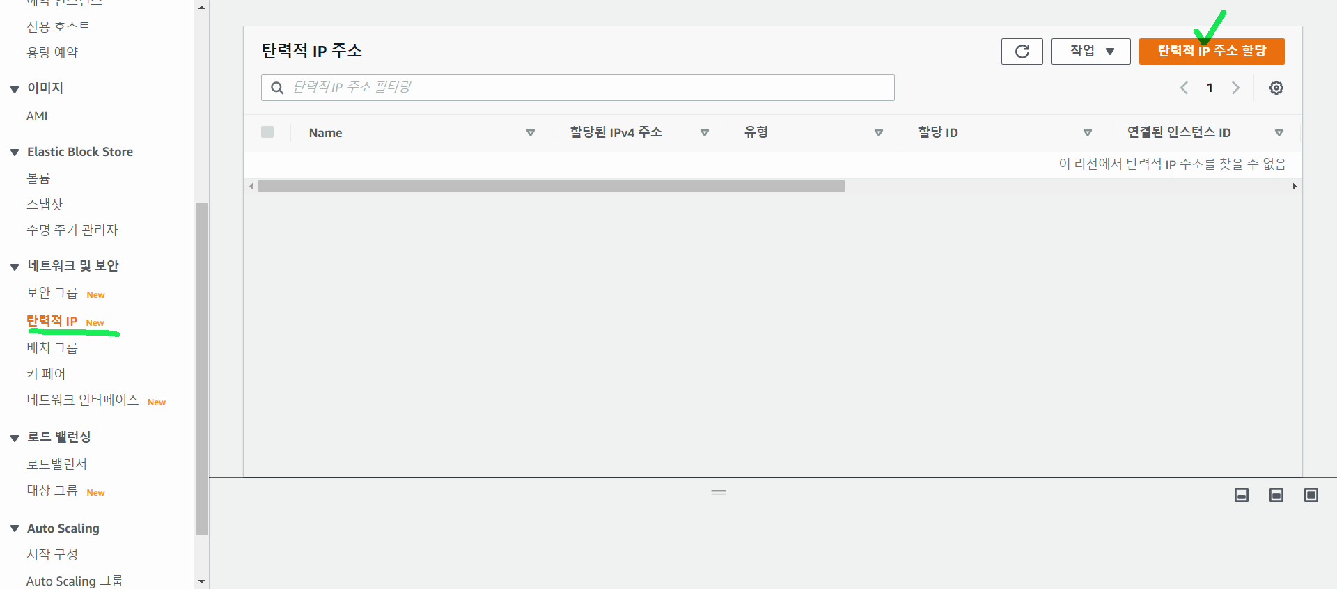 왼쪽 메뉴에서 Elastic IP 또는 탄력적 IP 클릭후