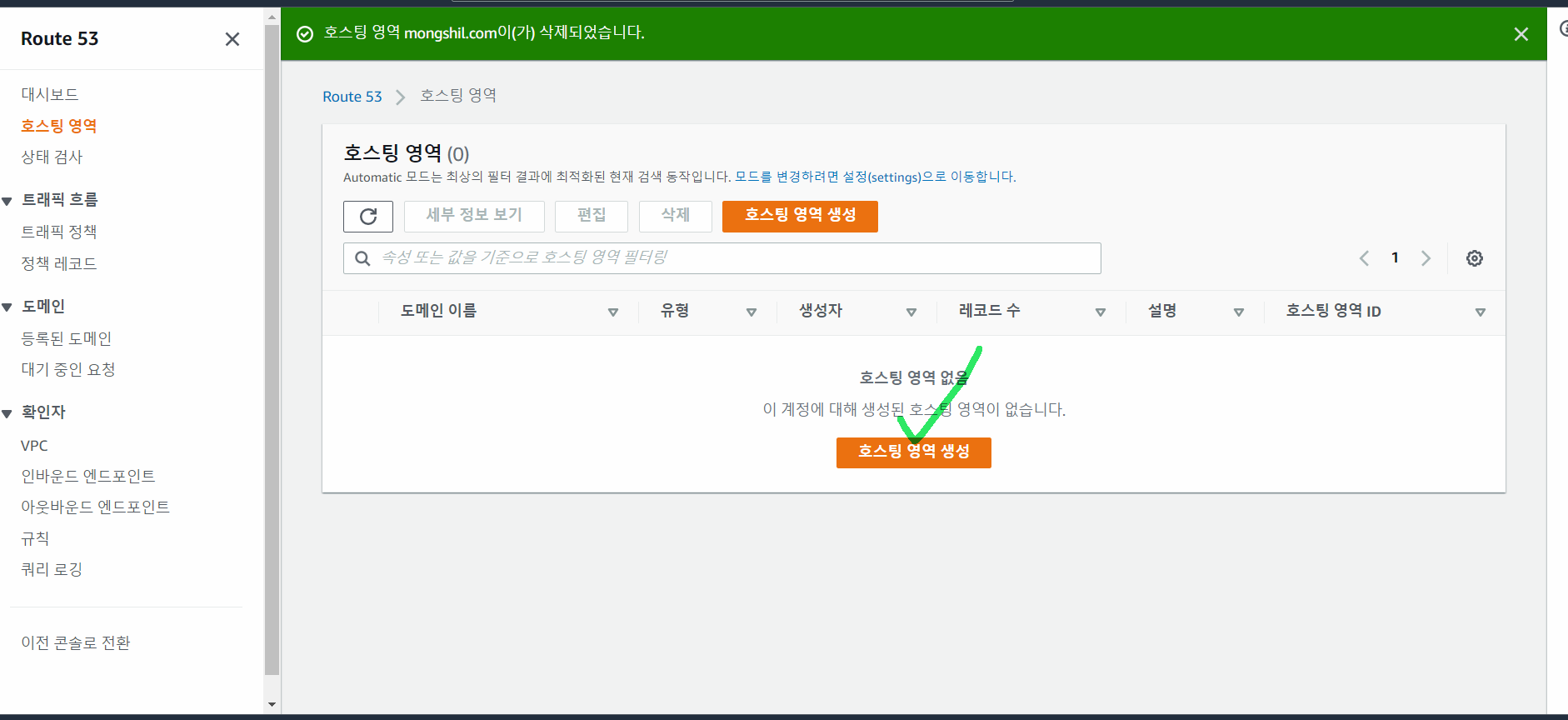 Route53 이동후 '호스팅 영역 생성' 을 클릭합니다.