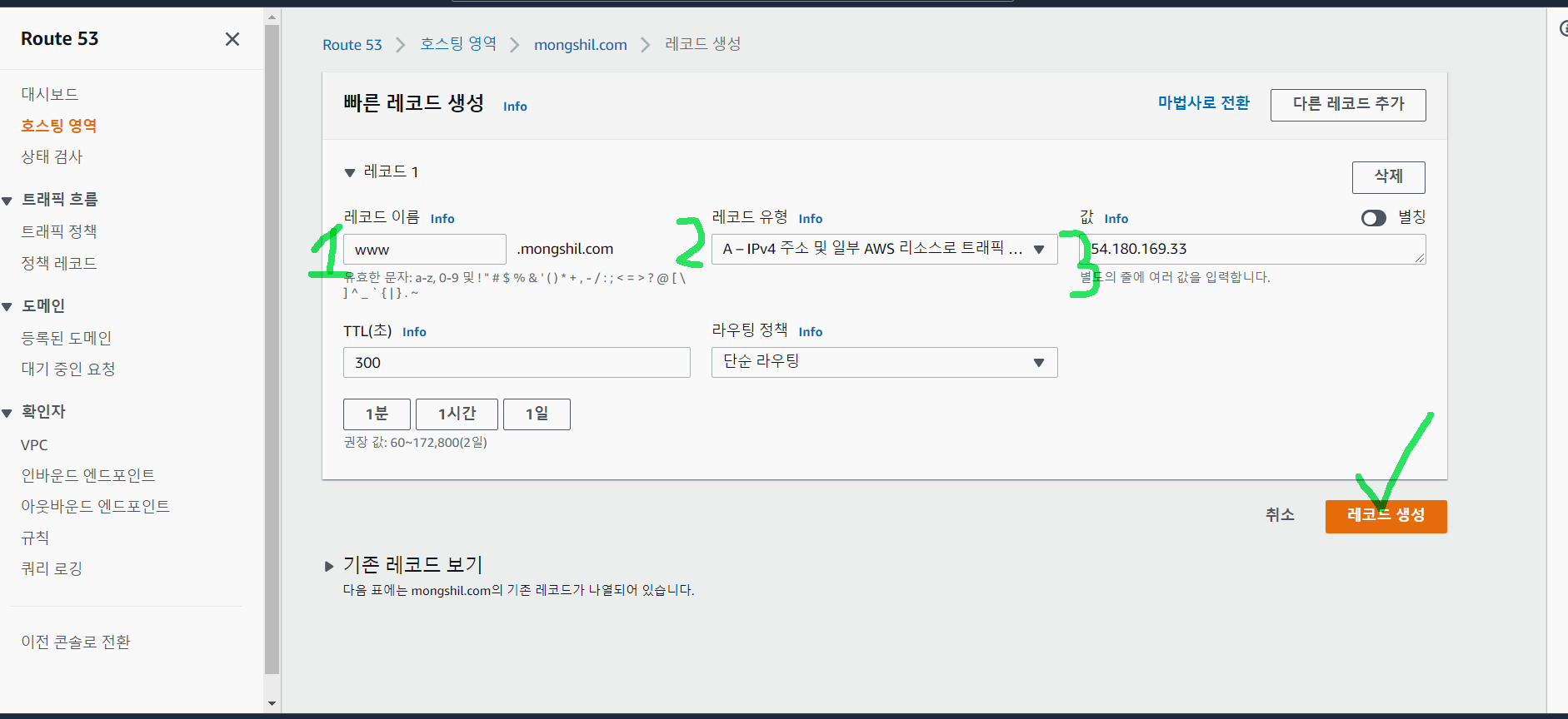 A 레코드를 생성하시고 나면 정상적으로 www.mongshil.com 을 주소창에 치게 되었을때