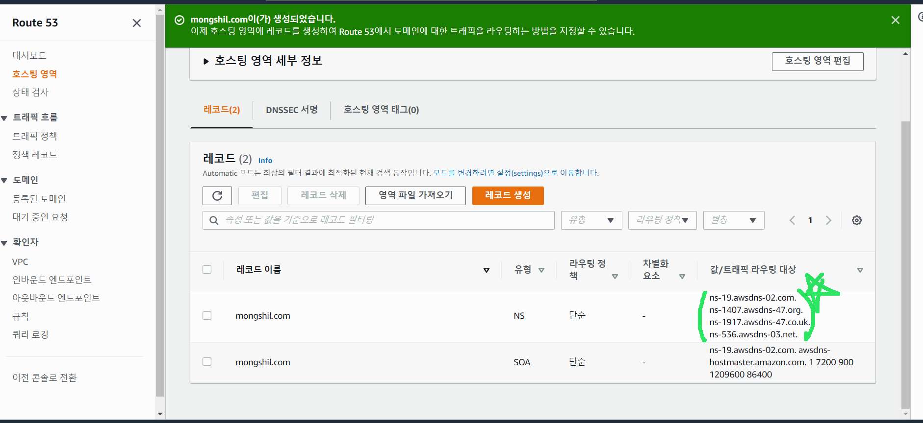 호스팅 영역 생성이 완료되면 mongshil.com의 NS, SOA 레코드 유형이 생기게됩니다.