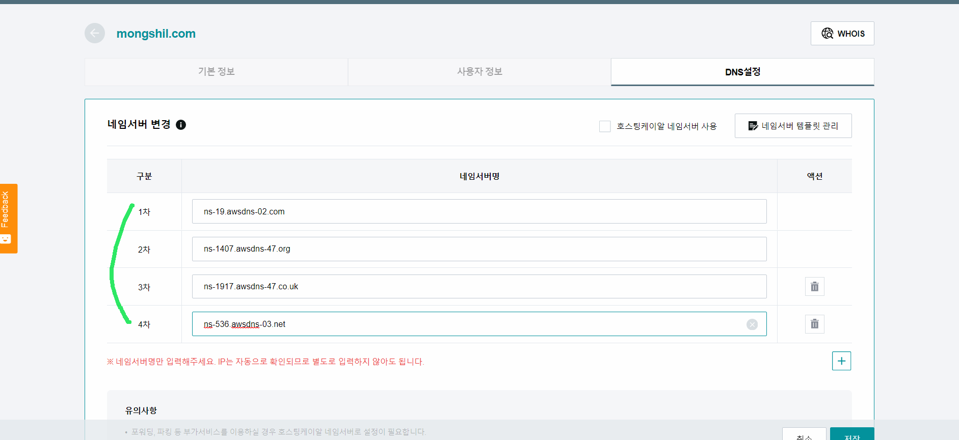 저는 도메인을 구입하였던 hosting.kr 로 들어가서 AWS Route53에서 부여받은 네임서버 4개를 입력하였습니다.